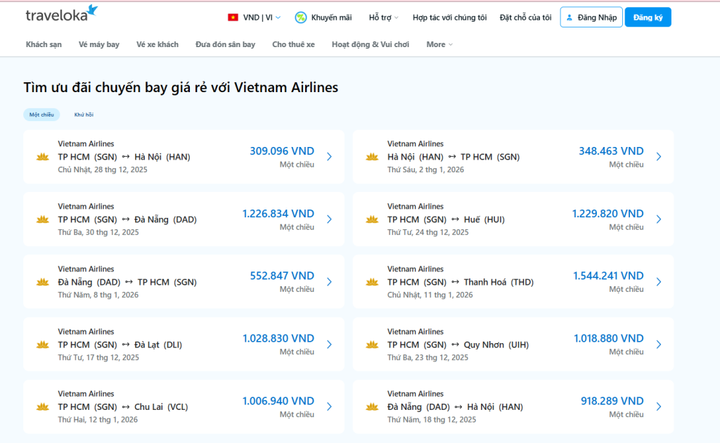 Bạn có thể dễ dàng tra cứu giá vé máy bay Hà Nội Sài Gòn hôm nay ngay trên ứng dụng hoặc website, so sánh các mức giá theo hãng bay và khung giờ để chọn được chuyến phù hợp nhất. Traveloka luôn cập nhật dữ liệu thời gian thực để mang đến các lựa chọn ưu đãi và chính sách vé linh hoạt, giúp kế hoạch di chuyển của bạn thuận tiện và tiết kiệm hơn.